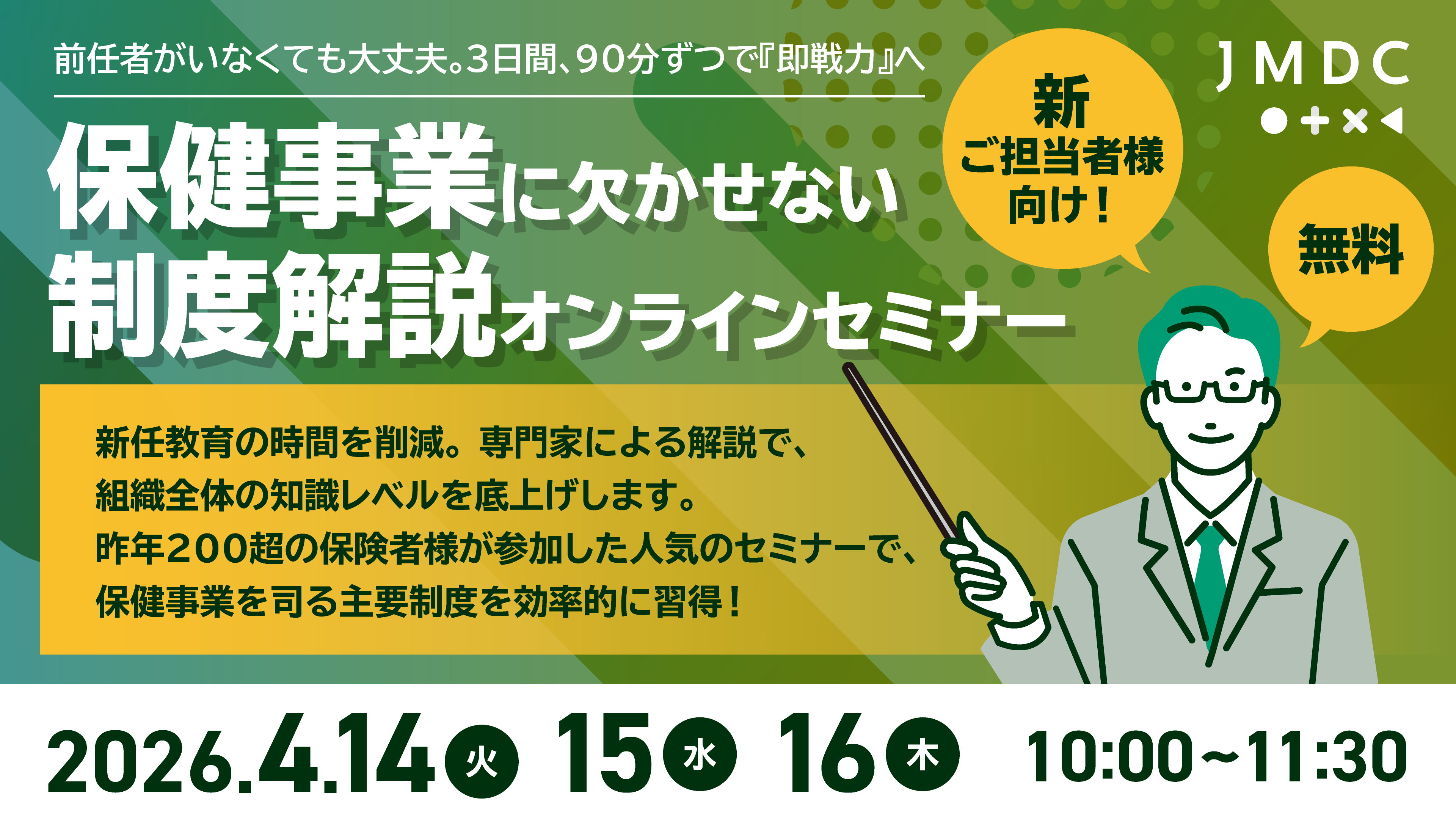 2026年4月14日(火)10:00-11:30 データヘルス計画/加算・減算制度解説 2026年4月15日(水)10:00-11:30 マイナポータル/民間PHR解説 2026年4月16日(木)10:00-11:30 健康スコアリング/コラボヘルス/健康経営解説 |