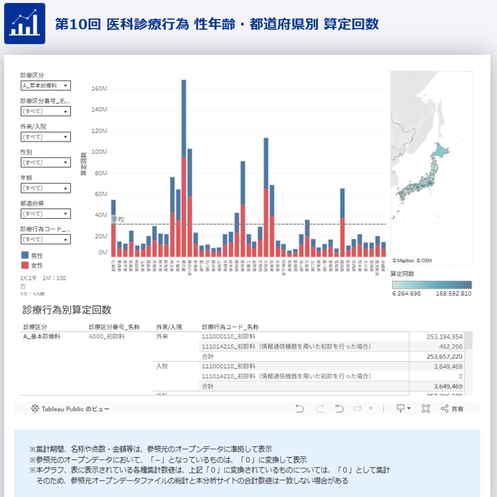 さらにNDBオープンデータを視覚的によりわかりやすく示したのが、厚労省による 「NDBオープンデータ分析サイト」です。Webサイト上の操作で条件を指定すると、それに対応する形で集計表をグラフ化してくれます。