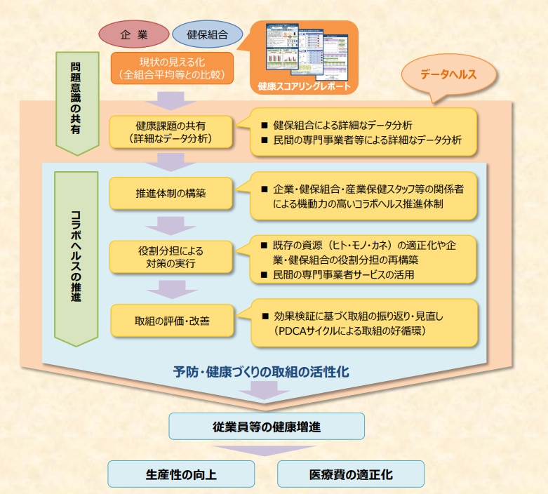 健康スコアリングレポートは、各健康保険組合の加入者の健康状態や医療費を可視化した公的なレポートです。コラボヘルスの推進に当たり、事業主と共通認識を持つためのコミュニケーションツールとして広く活用されています。