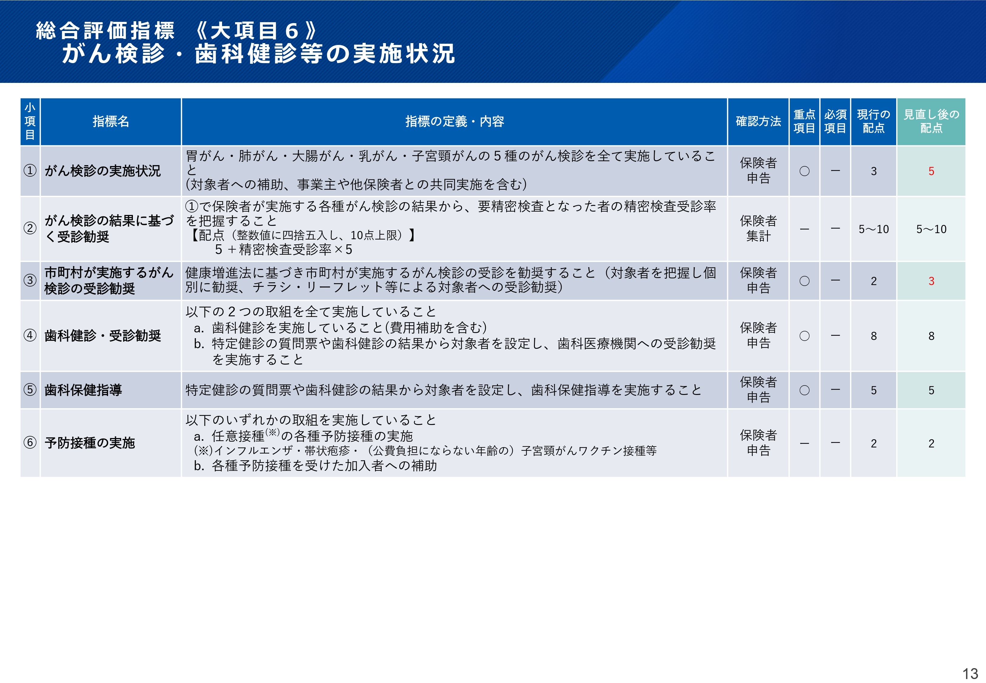 また、後期高齢者支援金の加算・減算制度においても、支援金の減算にかかわる総合評価指標において、上図の通り大腸がん対策が明記されています。第4期(2024年度)以降は、5つのがん検診(胃がん、肺がん、大腸がん、乳がん、子宮頸がん)をすべて実施している場合の加点が3点から5点に増加。また、実施したがん検診の精密検査受診率にかかわる評価項目は配点が最大10点と、大きな差がつく項目となっています。