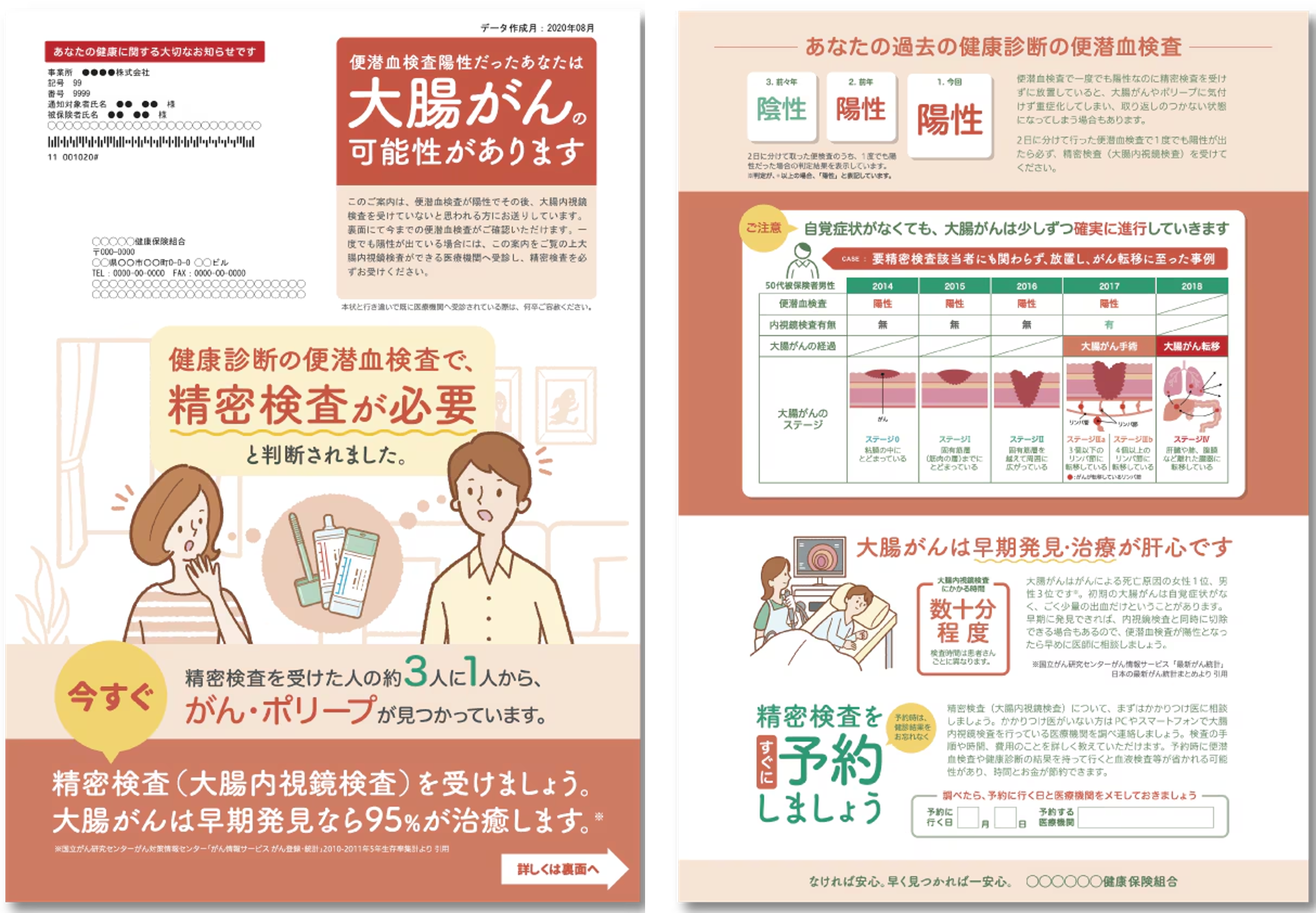 またJMDCが提供している「大腸がん精密検査勧奨通知」でも、ナッジ理論を取り入れています。本サービスでは、過去の大腸がん検診結果とレセプトデータをもとに、精密検査などが未受診と考えられる加入者を対象者として抽出。通知紙面では対象者に対し「あなたのためだけの大事な情報」である点を強調したり、現状のリスクと、受診で対象者が得られるメリットを端的に説明したりと、本人の自発的な受診を促すものとなっています。