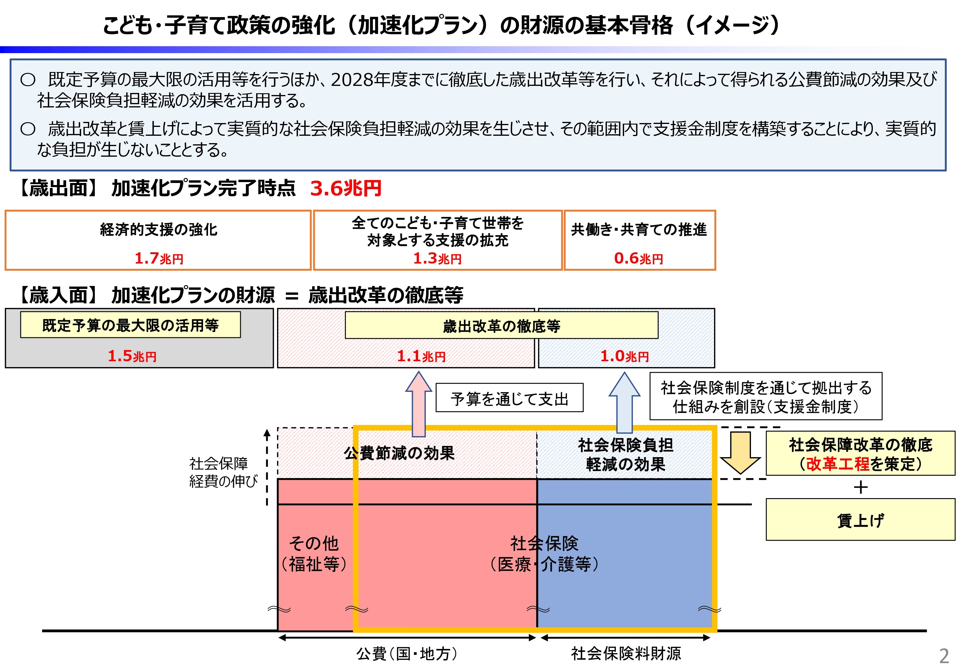 背景にあるのは、令和5年12月に「こども未来戦略」で取りまとめられた「こども・子育て支援加速化プラン」(加速化プラン)。同プランでは、児童手当の拡充など年間3.6兆円規模の給付拡充を目指しており、そのうち約1兆円を賄う特定財源として創設されたのが今回の支援金制度です。令和6年6月に関連法が成立しています。