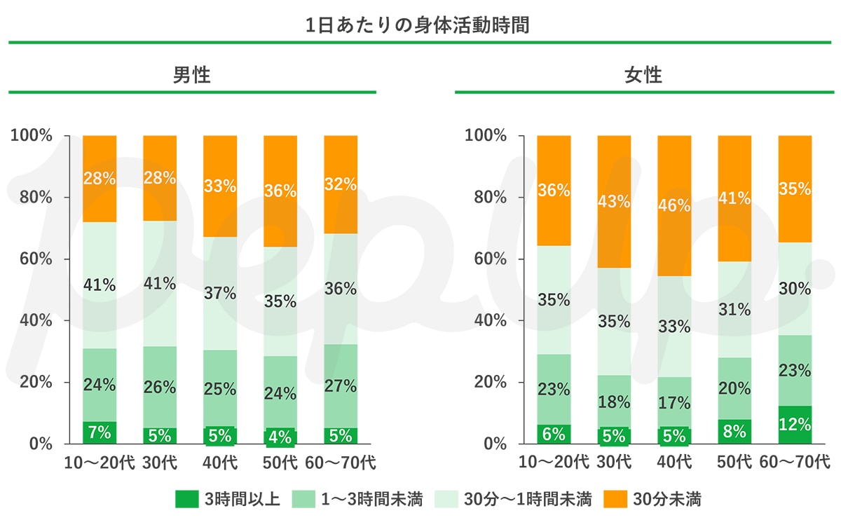 今回アンケートでは、Pep Upユーザーを対象に直近1カ月の日常生活における「歩行以上の身体活動時間」について回答いただきました。