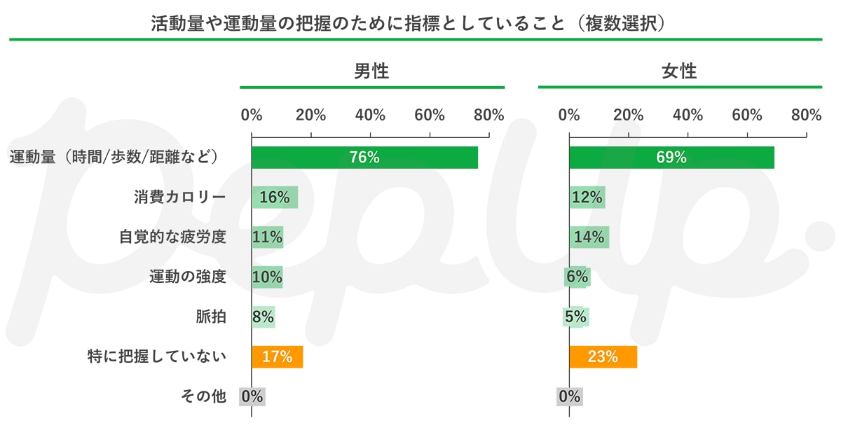 アンケートの結果を見ると、男女とも「運動量」を指標としていると回答した人が最も多くなりました。運動量の把握方法としては、運動時間や、歩く・走るといった運動であればその距離などが含まれます。