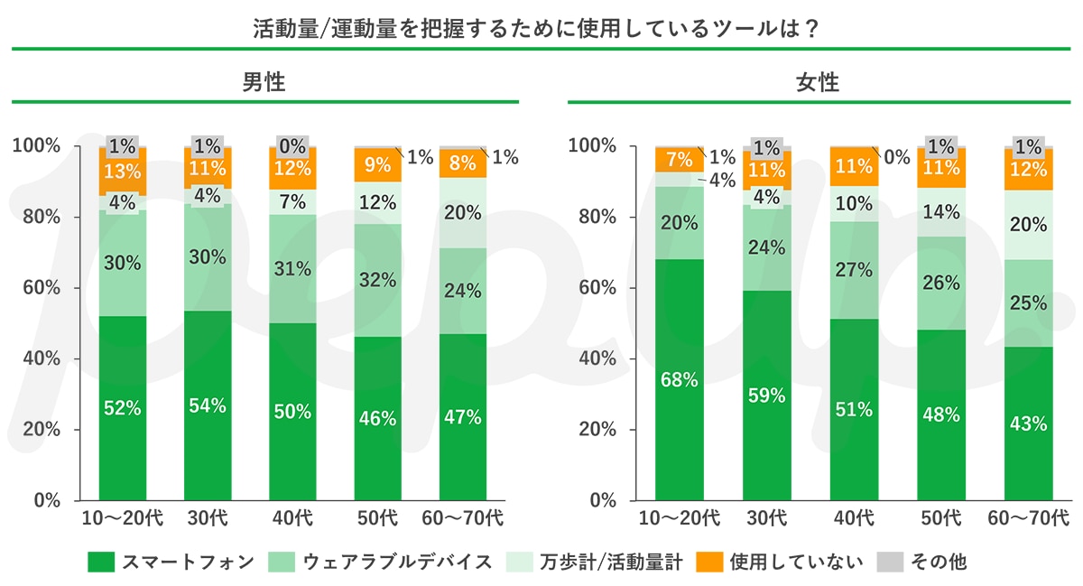 一方20〜30代女性では、約6〜7割がスマートフォンを使用、女性の全年代において2〜3割程度がウェアラブルデバイスを使用して活動量・運動量を把握しているという結果でした。