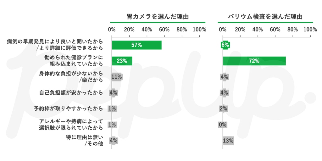 直近の健診で胃カメラ・バリウム検査を選んだ理由を伺ったところ、胃カメラを選んだ理由の1位が「病気の早期発見に胃カメラの方が良いと聞いたから(57%)」、バリウム検査を選んだ理由の1位が「健診プランに組み込まれていたから(72%)」となりました。